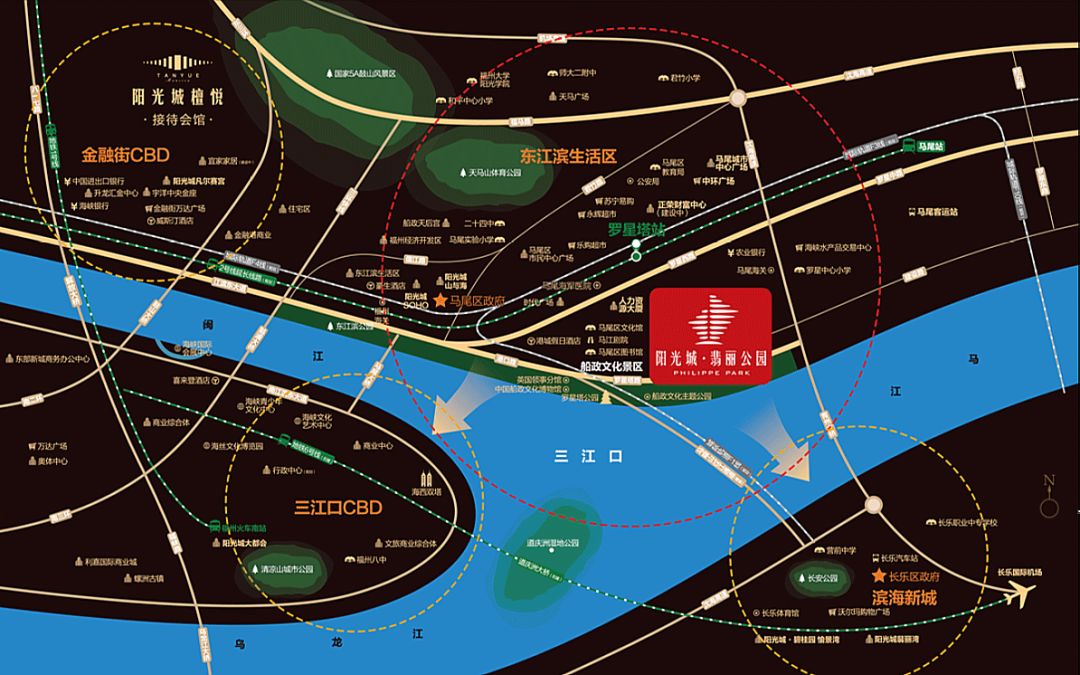 阳光城以世界500强的战略眼光与视野,把脉城市发展大势,落子马尾东江滨价值核心,打造【睿】life酒店感江景住区——阳光城翡丽公园。项目坐拥丰沛城市资源配套,乐购超市、永辉超市、马尾城市中心广场、中环广场环伺;毗邻天马山、罗星塔、船政公园等三大公园;咫尺地铁2号线罗星塔站,多条公交接驳,快速畅达福州;幼儿园、小学、中学等多所优质学校环绕,构筑全程优质教育链,预见孩子美好未来。